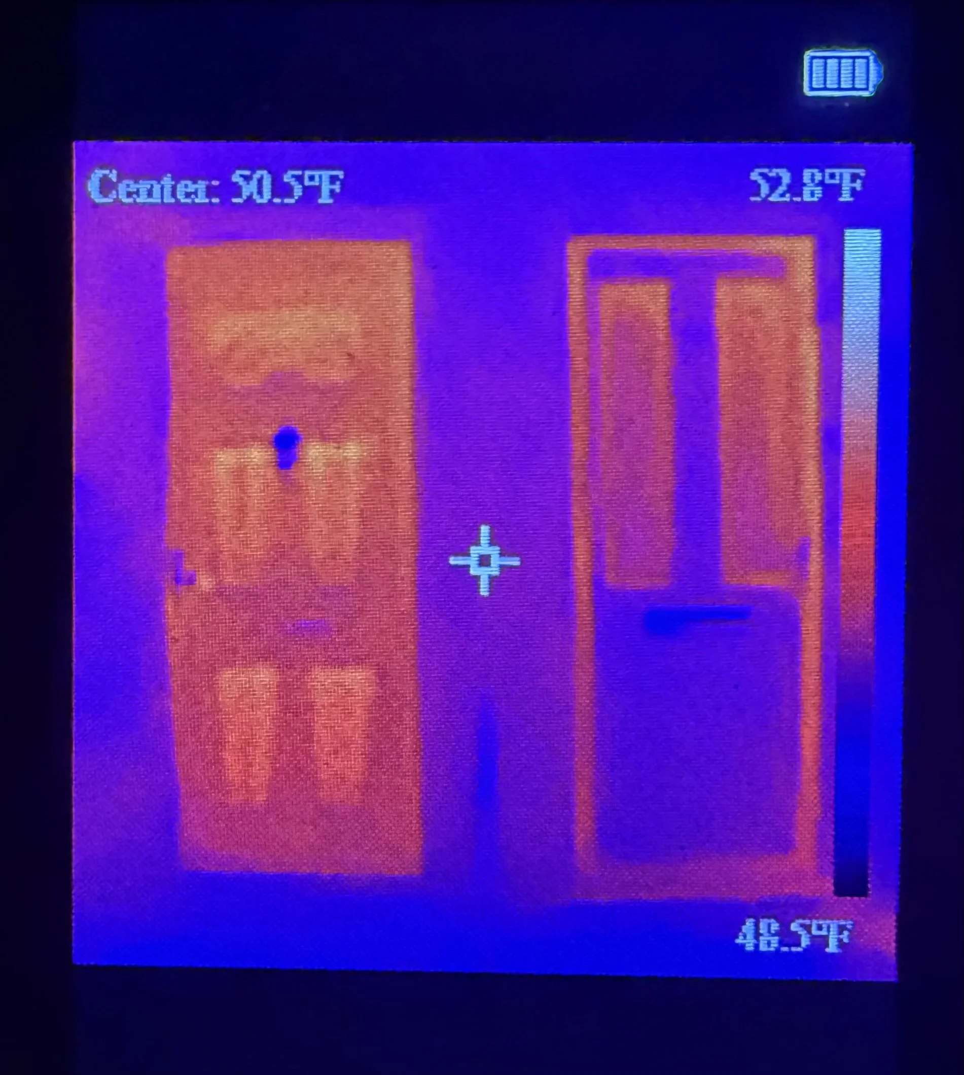 Both uPVC and composite doors installed by Driftwood Home Improvements are far more energy efficient than older doors. However, composite doors generally offer better overall thermal performance due to their thicker construction and solid core. See the thermal image below showing a uPVC door on the left, and a composite door on the right.